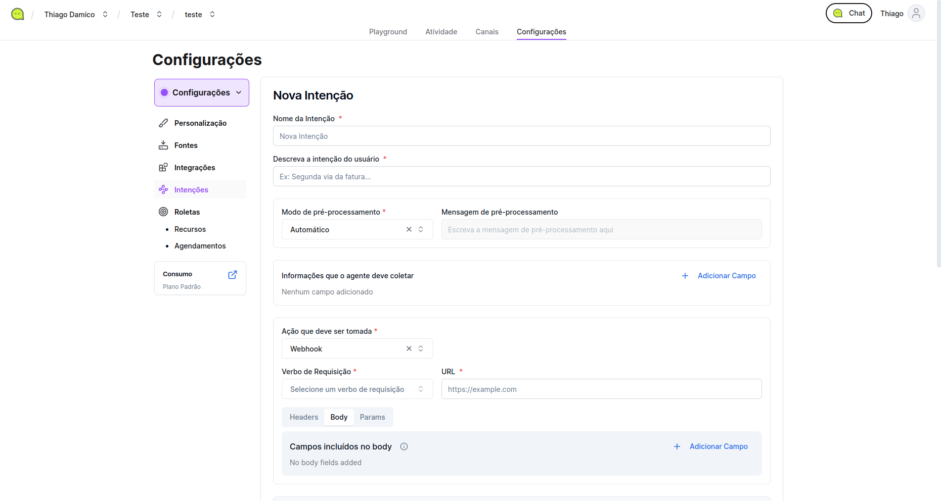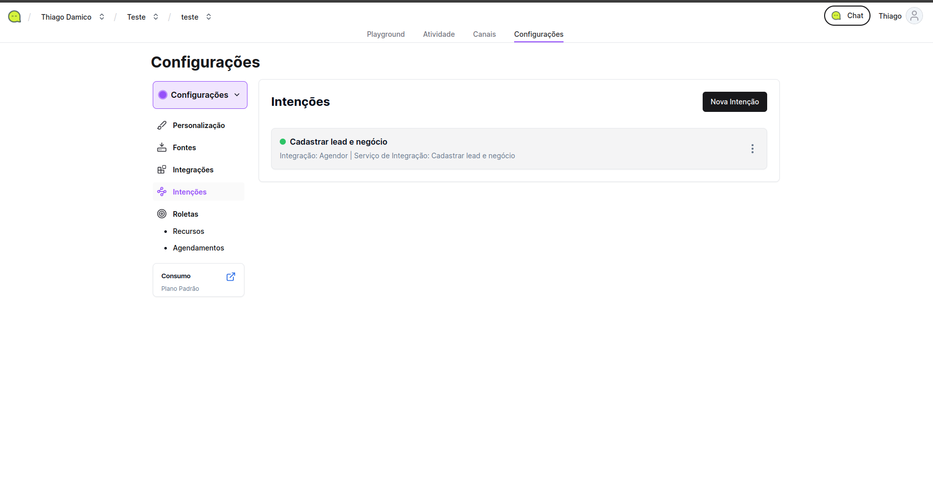 2. Para adicionar uma nova intenção, clique no botão Nova Intenção.