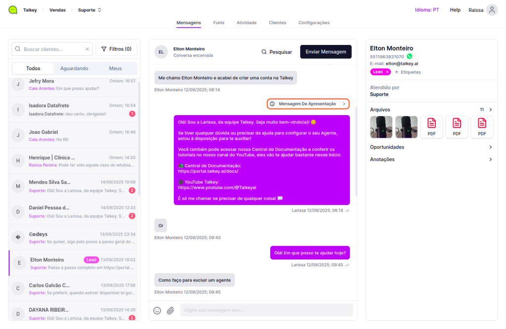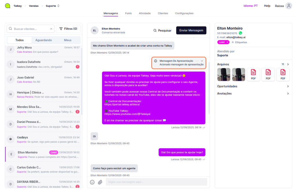 O Talkey permite transformar conversas em vendas de forma inteligente por meio das Intenções de IA. Com essa funcionalidade, é possível definir como o Agente deve agir diante de perguntas específicas, criando fluxos personalizados que automatizam atendimentos e direcionam clientes para oportunidades reais de negócio.