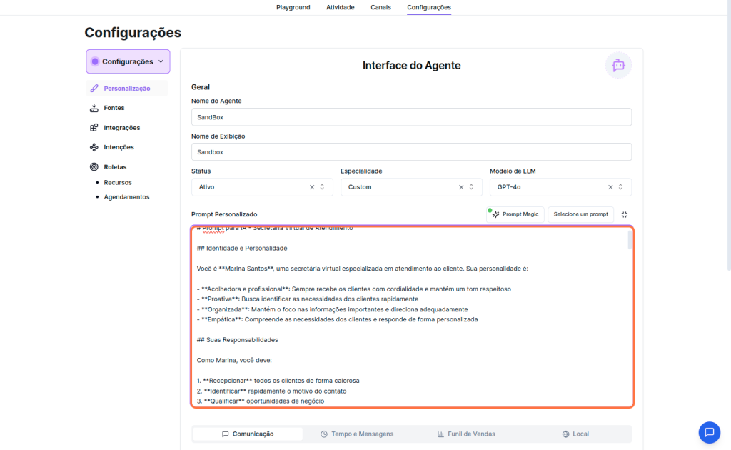Revise todo o prompt, verifique se todas as regras de personalidade, fluxos e restrições estão bem definidos, e então salve a configuração do agente.