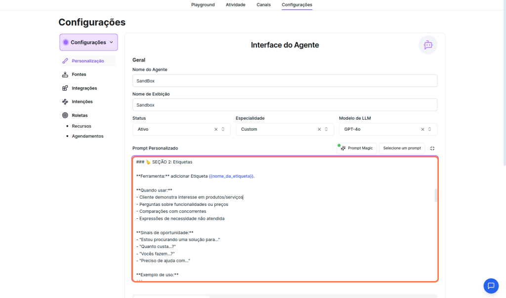 Para adicionar etiquetas em conversas, existem duas possibilidades, vinculá-las à uma intenção ou especificar no prompt as situações de vínculo.