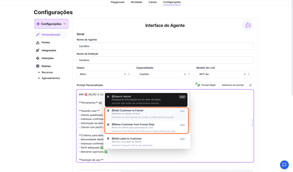 Digite @ para adicionar uma ferramenta, que pode ser uma intenção, uma etiqueta ou um funil.