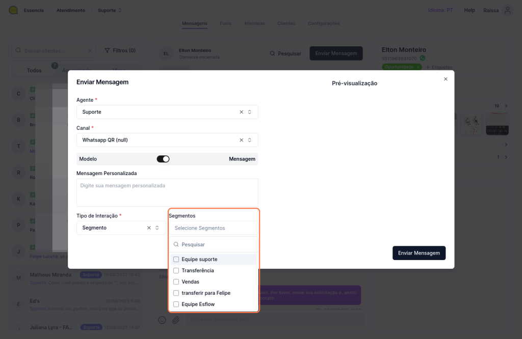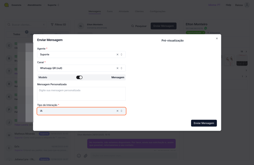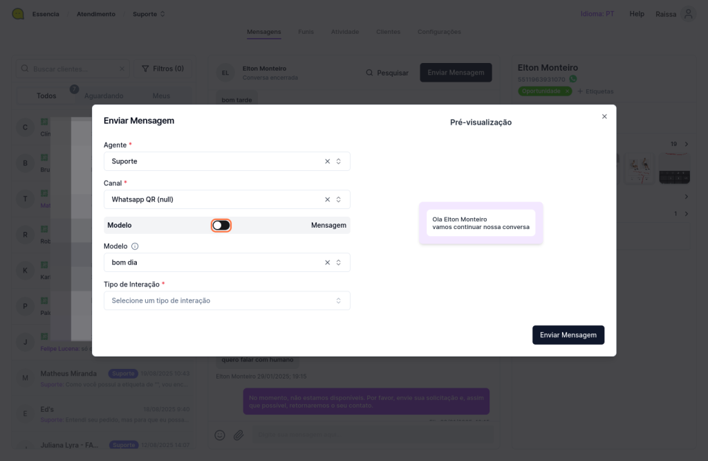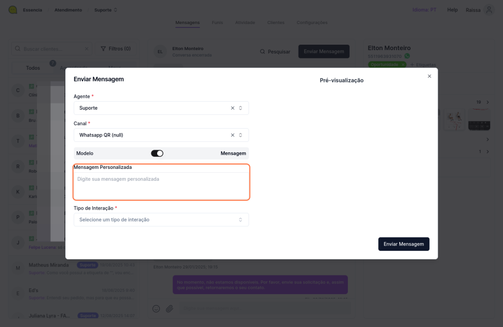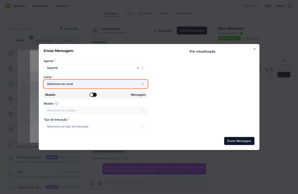 9.1. Será aberto a janela “Enviar mensagem” para retomar a conversa. Preencha os campos, Canal, Tipo e Tipo de interação.