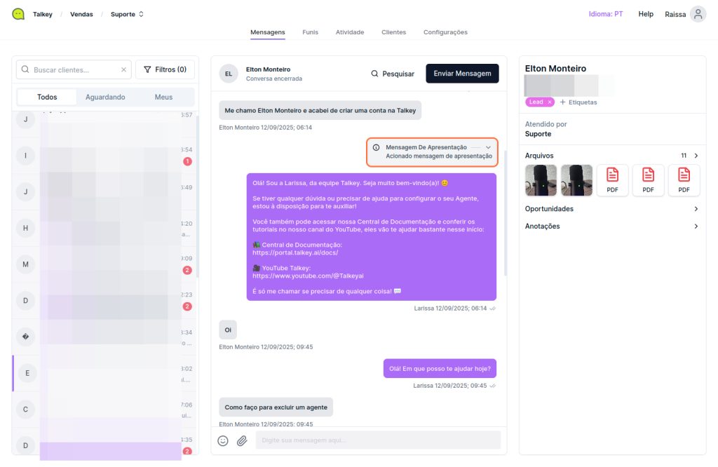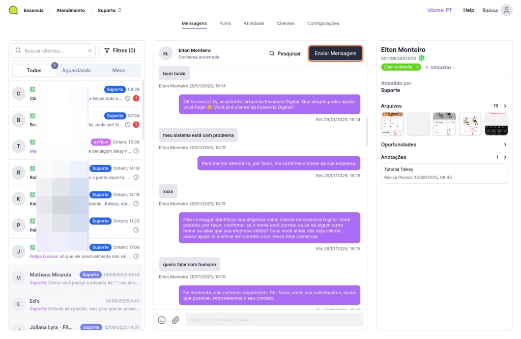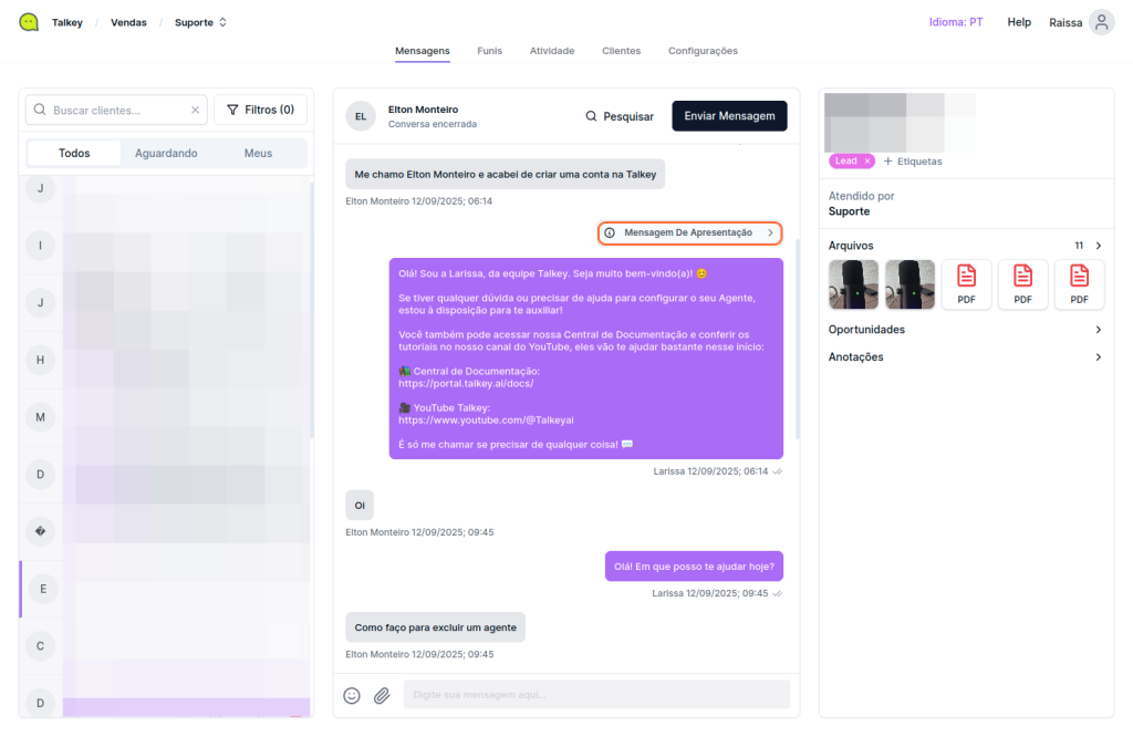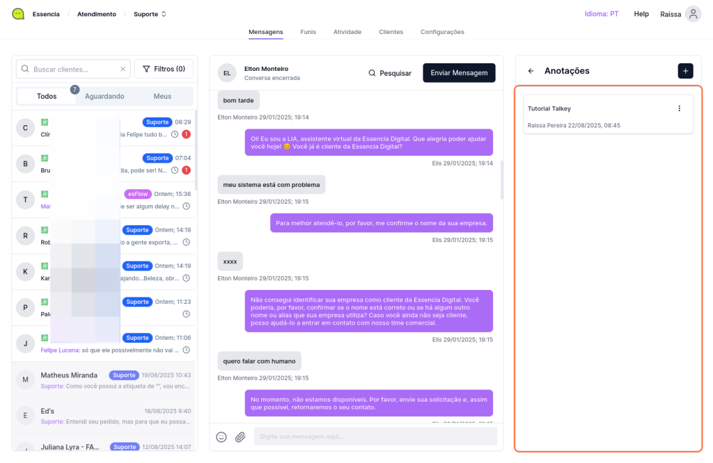 Ao dominar as ferramentas de gerenciamento de atendimentos do Talkey, você assegura um fluxo de trabalho mais eficiente e uma comunicação mais eficaz com seus clientes. Aproveite os recursos disponíveis para personalizar e agilizar seus atendimentos, elevando a qualidade do seu serviço. Caso necessite de mais ajuda, consulte a documentação oficial ou entre em contato com o suporte do Talkey.