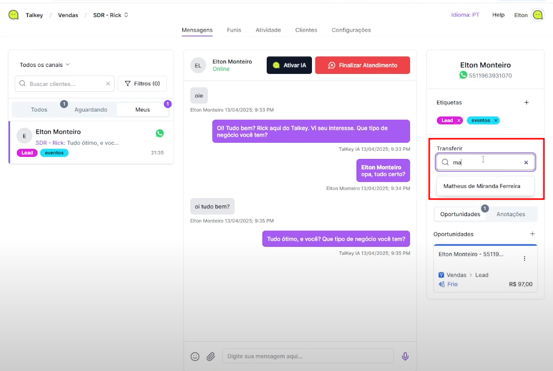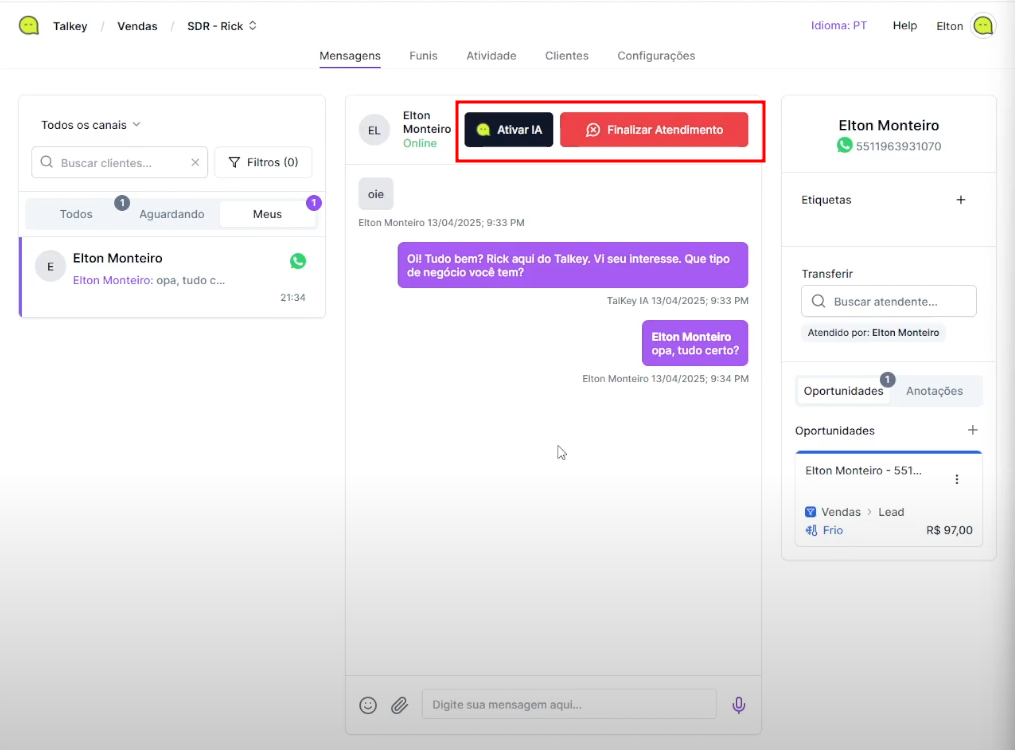 - Existem três abas: “Todos” (exibe todos os atendimentos), “Aguardando” (quando a IA transfere para um humano) e “Meus” (atendimentos que você está atendendo).