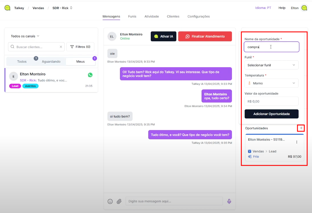 8.2. Para adicionar uma oportunidade, selecione a aba “Oportunidades” e clique no ícone de “+”, preencha as informações e clique em “Adicionar Oportunidade”.
