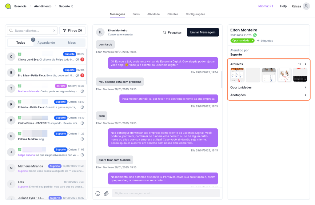 8. No menu lateral direito, você tem acesso ao gerenciamento de arquivos enviados na conversa, oportunidades e anotações.