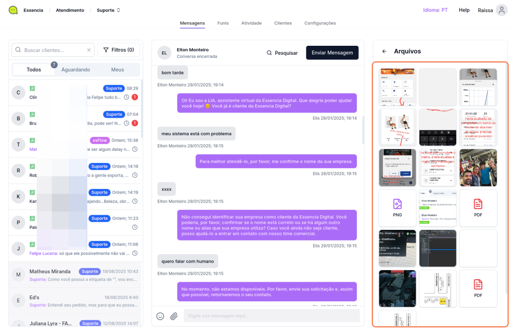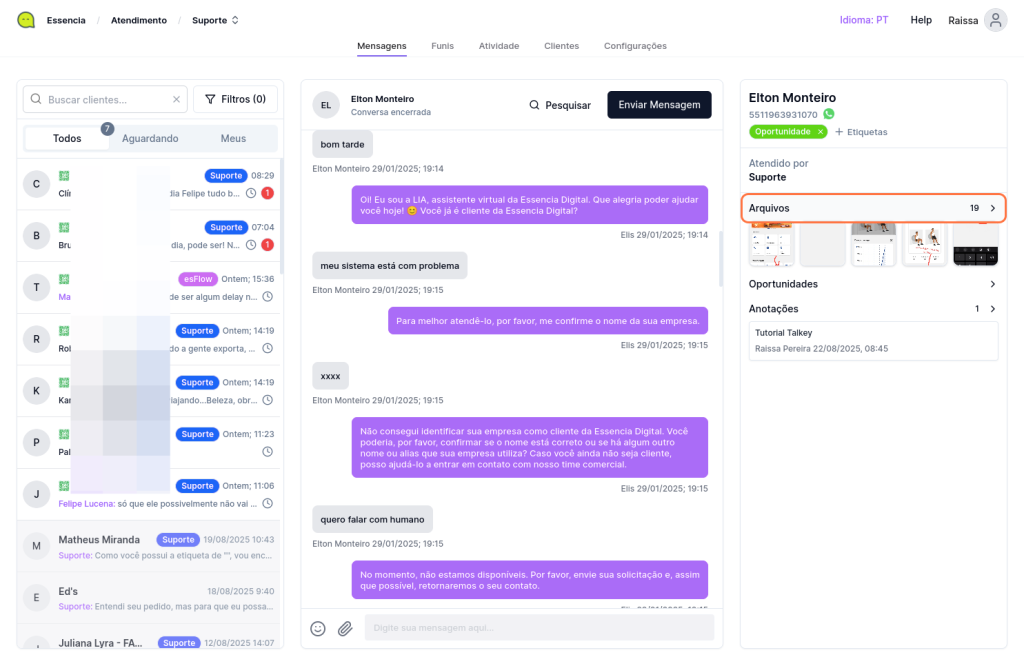 8.1. Para acessar todas as imagens e documentos enviados na conversa, clique na opção Arquivos.