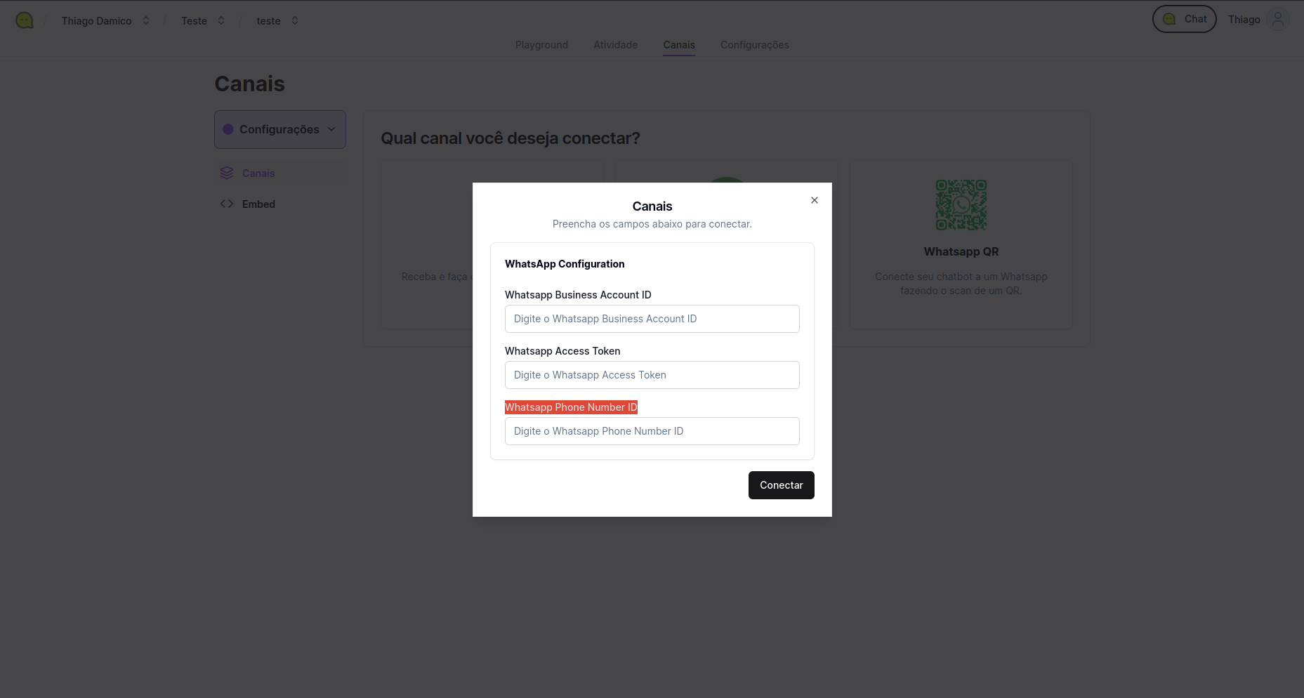 3. Com a opção WhatsApp API Oficial é necessário que você tenha realizado as configurações no painel da Meta antes dessa etapa.Para conectar esse canal basta informar o Whatsapp Business Account ID, Whatsapp Access Token e Whatsapp Phone Number ID e clicar em Continuar.