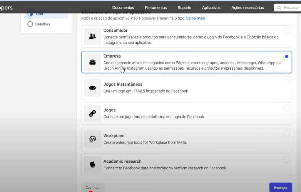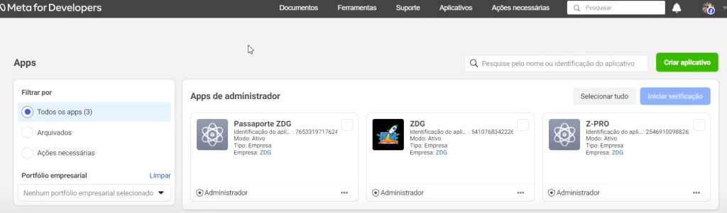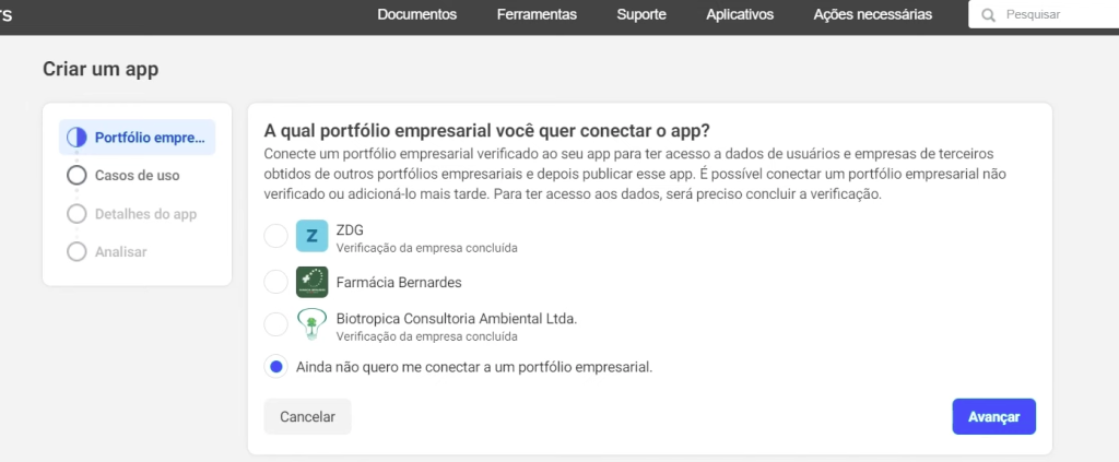 - Acesse Meta for Developers → My Apps → Create App → escolha o tipo Business, preencha os dados necessários e finalize.