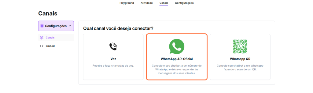 - Dentro de canais, escolha a opção Whatsapp API Oficial.