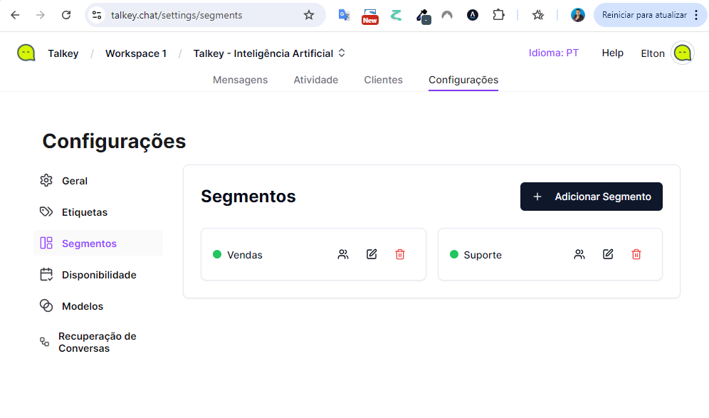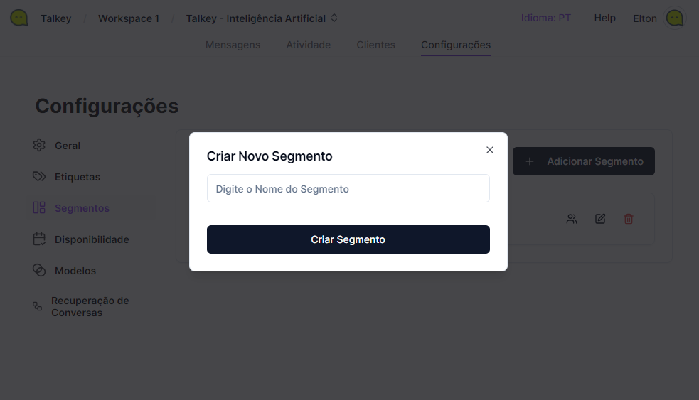 Os segmentos no Talkey funcionam como departamentos dentro da plataforma. Eles permitem organizar os atendimentos e distribuir os membros da equipe de forma eficiente. Este tutorial guiará você pelo processo de criação de segmentos e vinculação de usuários a cada segmento.