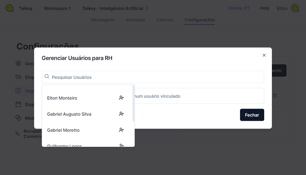 - No painel do Talkey, clique na aba “Configurações” na parte superior da tela.