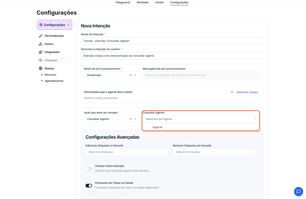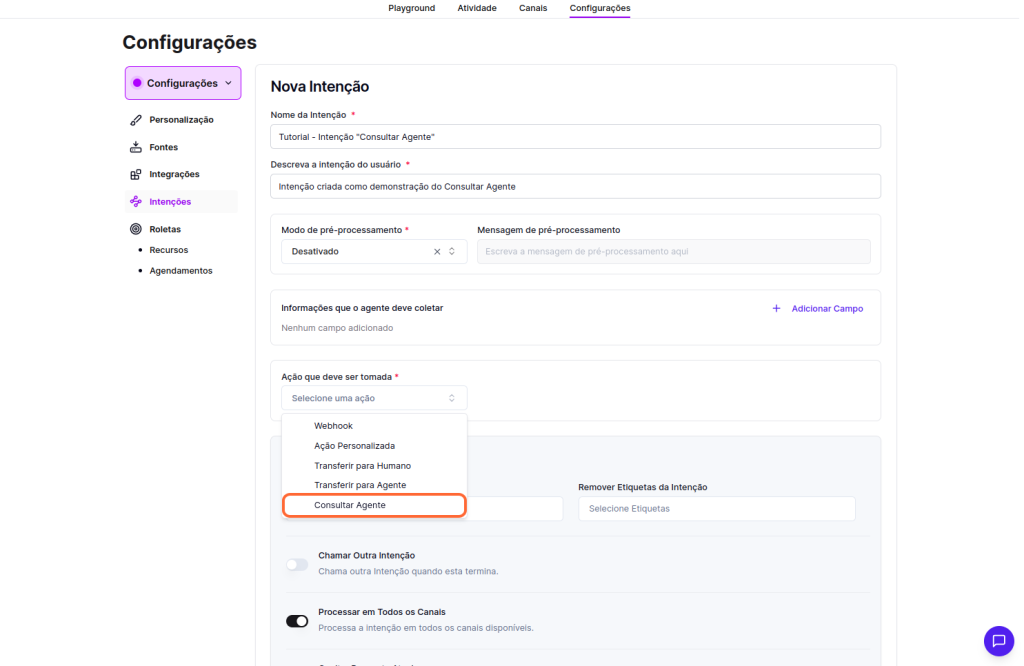 2. Preencha os campos: “Nome da Intenção”, “Descreva a Intenção do usuário”, “Modo de pré-processamento”, e se necessário, você pode adicionar informações que a IA deve coletar antes de seguir com a ação. Após preencher esses campos obrigatório selecione a ação que a IA deve tomar, para esse tutorial vamos utilizar o “Consultar Agente”.