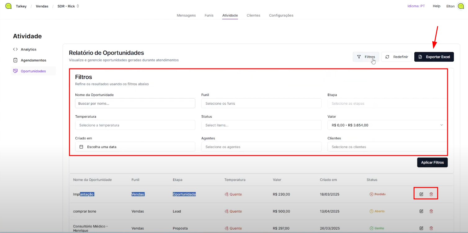 - Além disso, é possível exportar todas as oportunidades para um arquivo .xlsx. Para isso, basta clicar no botão “Exportar Excel“.