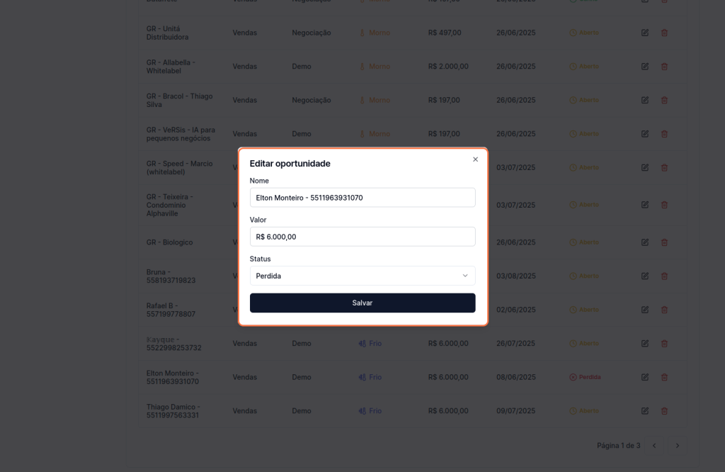 - Na edição da oportunidade, você consegue editar os seguintes dados: