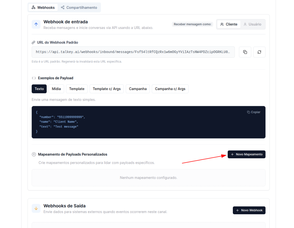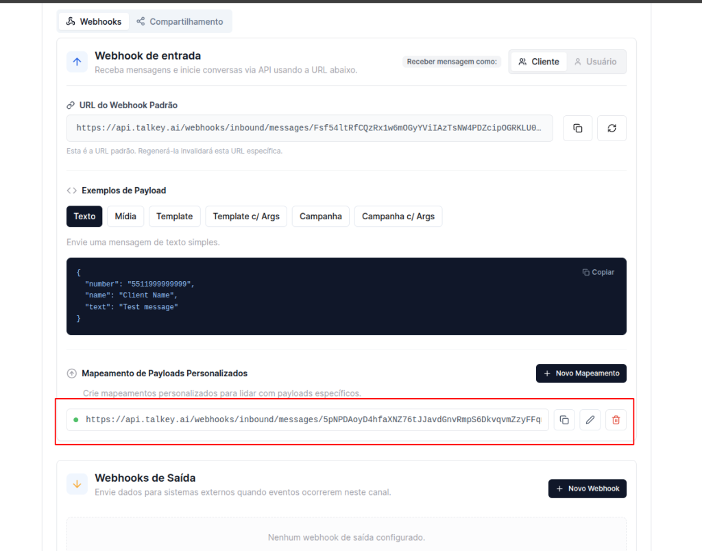 Com os mapeamentos de payloads personalizados, você consegue adaptar qualquer integração externa ao seu canal da Talkey! Cada mapeamento gera uma URL exclusiva, permitindo que diferentes sistemas enviem dados em seus próprios formatos sem precisar alterar o payload de origem.