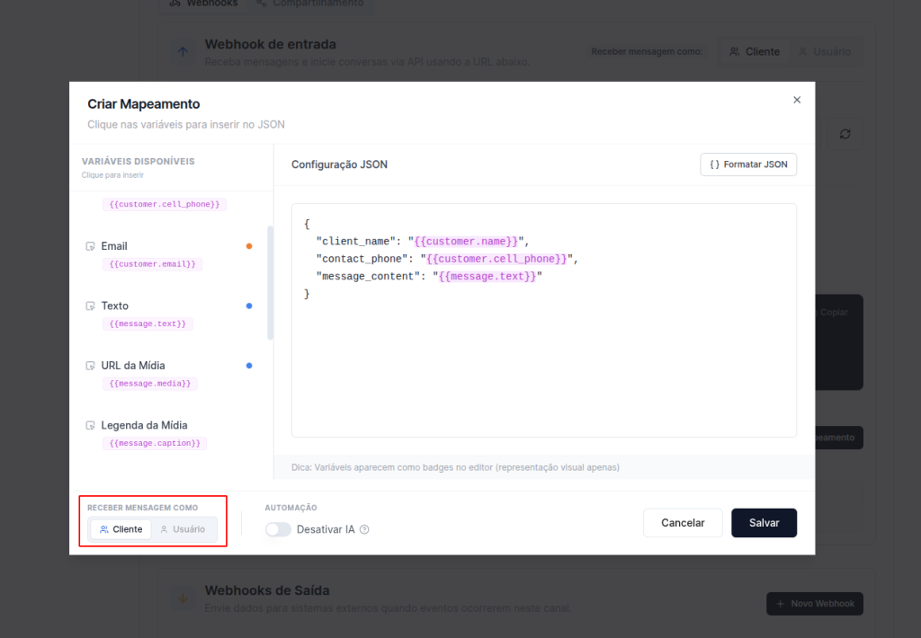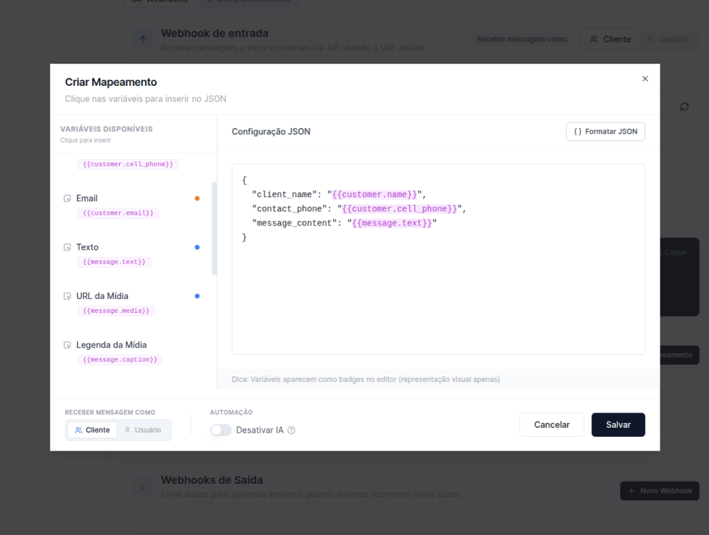 - Painel direito: editor JSON onde você monta o mapeamento. Clique em uma variável no painel esquerdo para inseri-la no editor.
