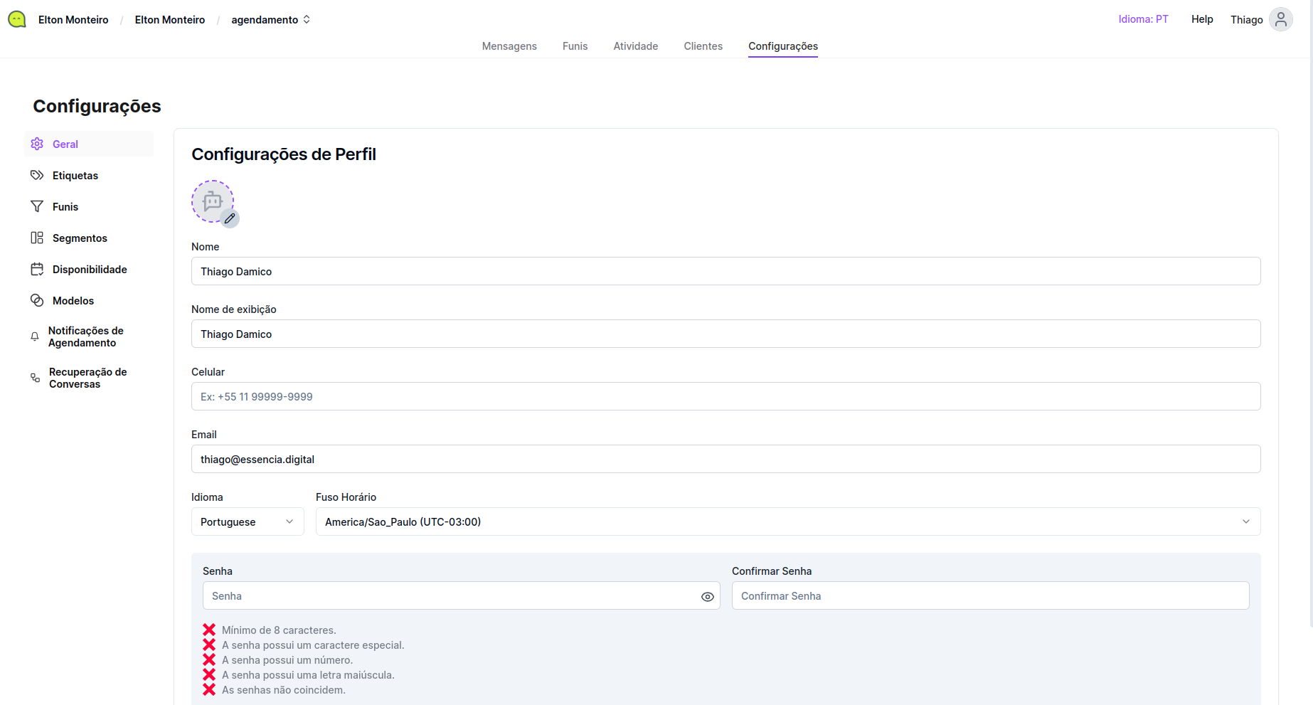- Para editar os dados de perfil basta acessar a aba “Configurações” e clicar na opção “Geral” no menu lateral. Nessa tela é possível editar o Nome, Nome de exibição, Celular, Email, realizar troca de senha e mais algumas coisas relacionadas a perfil.