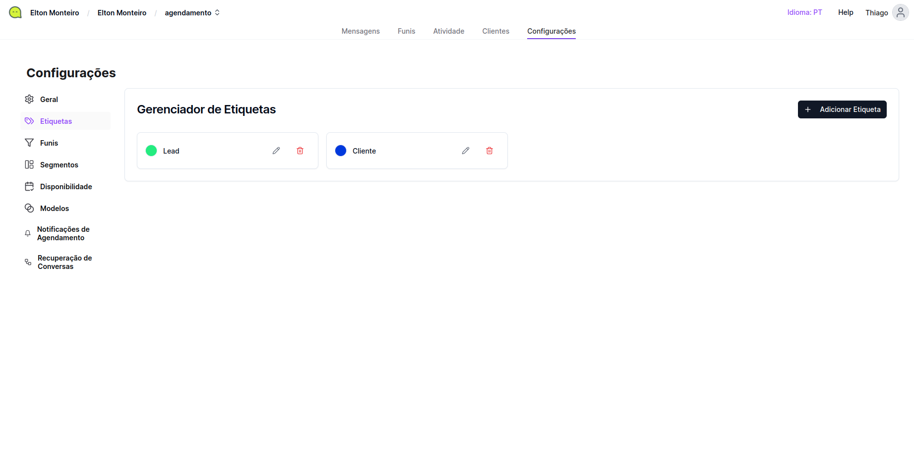 - Para adicionar as etiquetas basta acessar a aba Configurações e clicar na opção Etiquetas no menu lateral. Nessa tela é possível adicionar, editar e deletar etiquetas.
