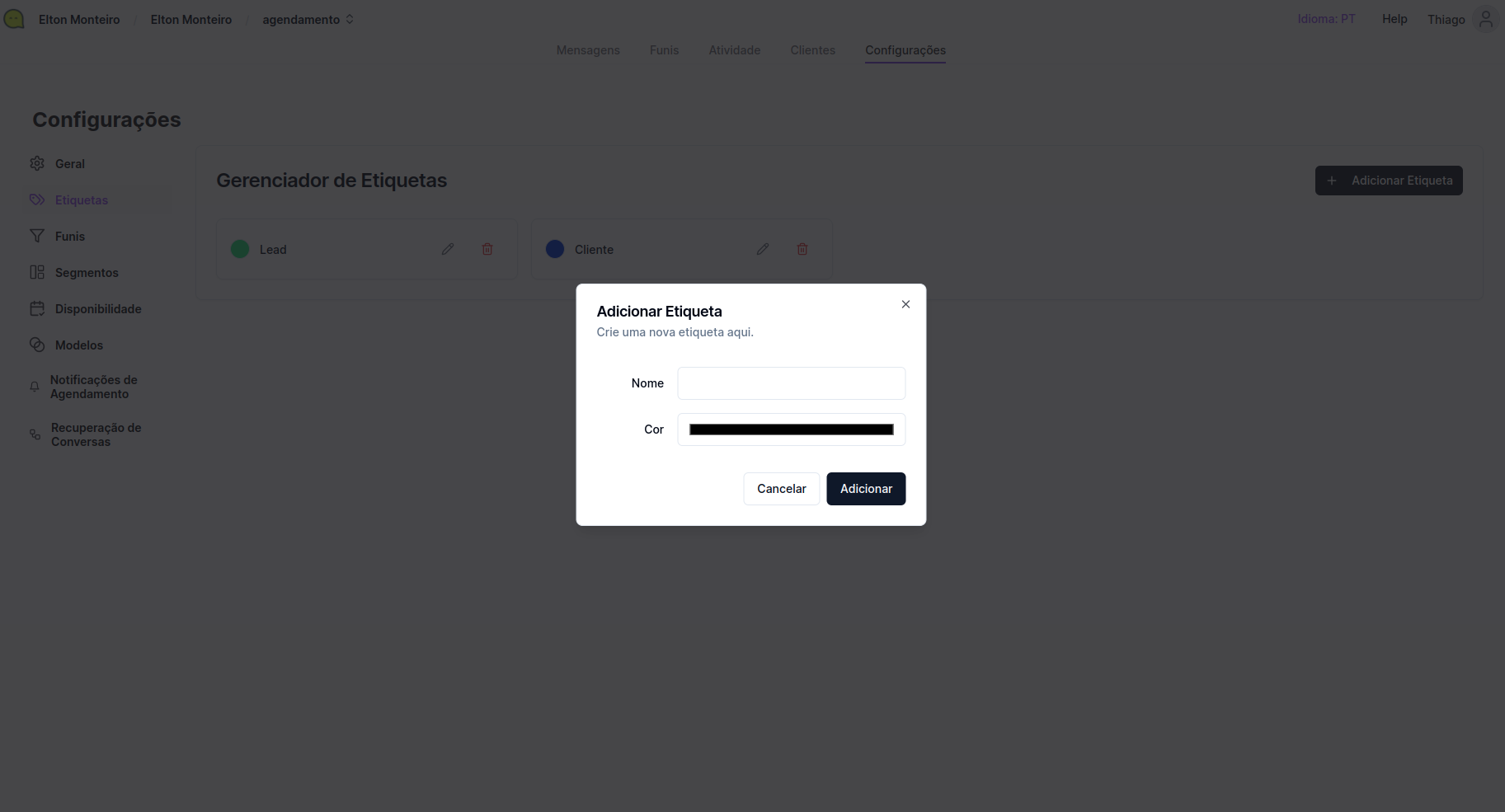 2. Para adicionar uma etiqueta, basta clicar em Adicionar Etiqueta informar Nome e Cor e clicar em Adicionar.