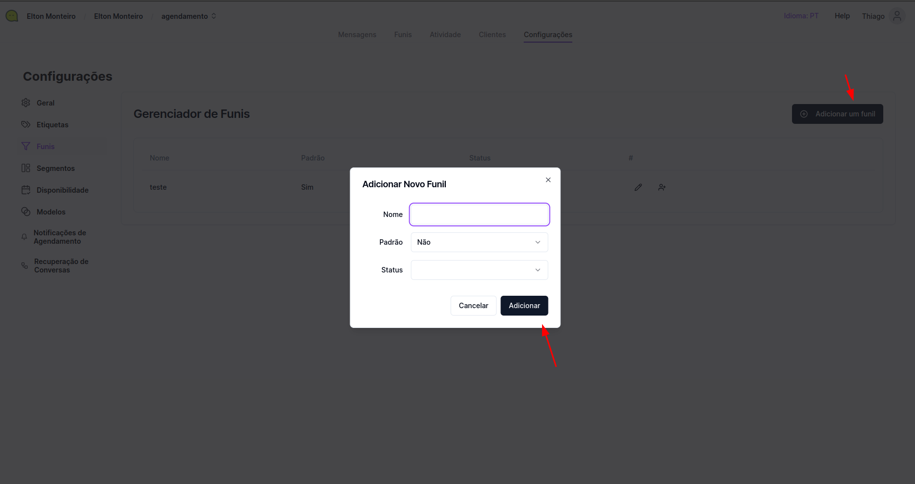 - Para criar um Funil, basta clicar em Adicionar um funil, preencher as informações e clicar em Adicionar.
