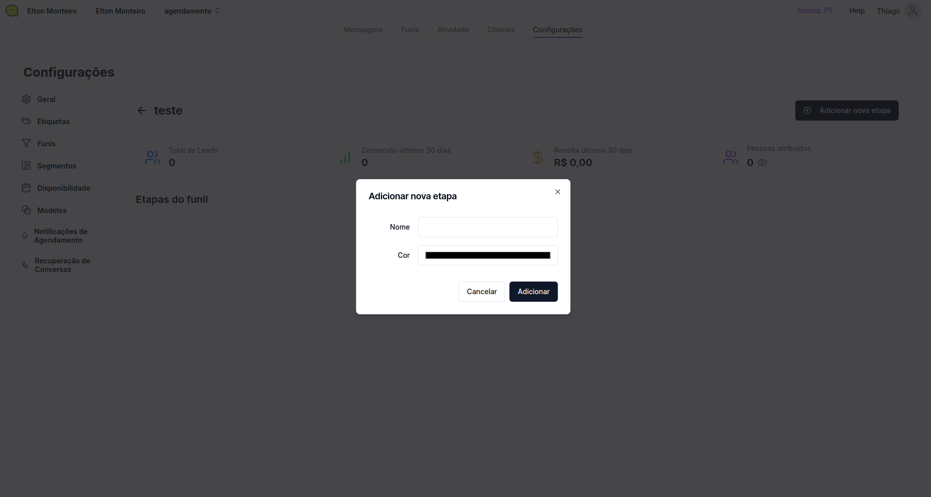 3. Dentro do funil é possível adicionar uma nova etapa, para isso clique em Adicioncar nova etapa, preencha as informações e e clique em Adicionar.