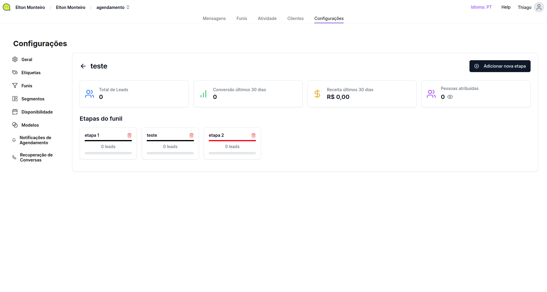 - Para adicionar e visulizar os Fuins basta acessar a aba Configurações e clicar na opção Funis no menu lateral. Nessa tela é possível adicionar, e editar funil e adicionar, editar e visualizar as etapas.