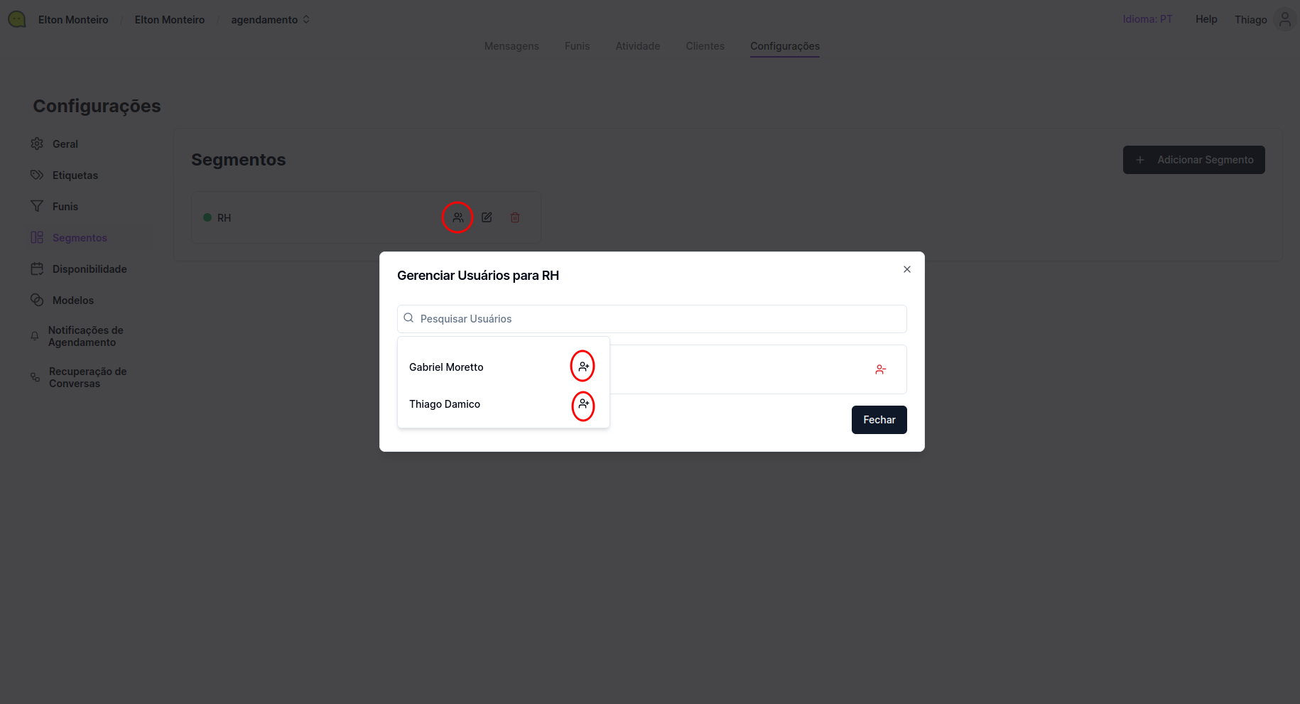 3. Após criar o segmento, você pode gerenciar os usuários vinculados a ele. Para isso, clique no ícone de “pessoa” dentro do card do segmento, pesquise pelos usuários desejados e vincule-os ao segmento.