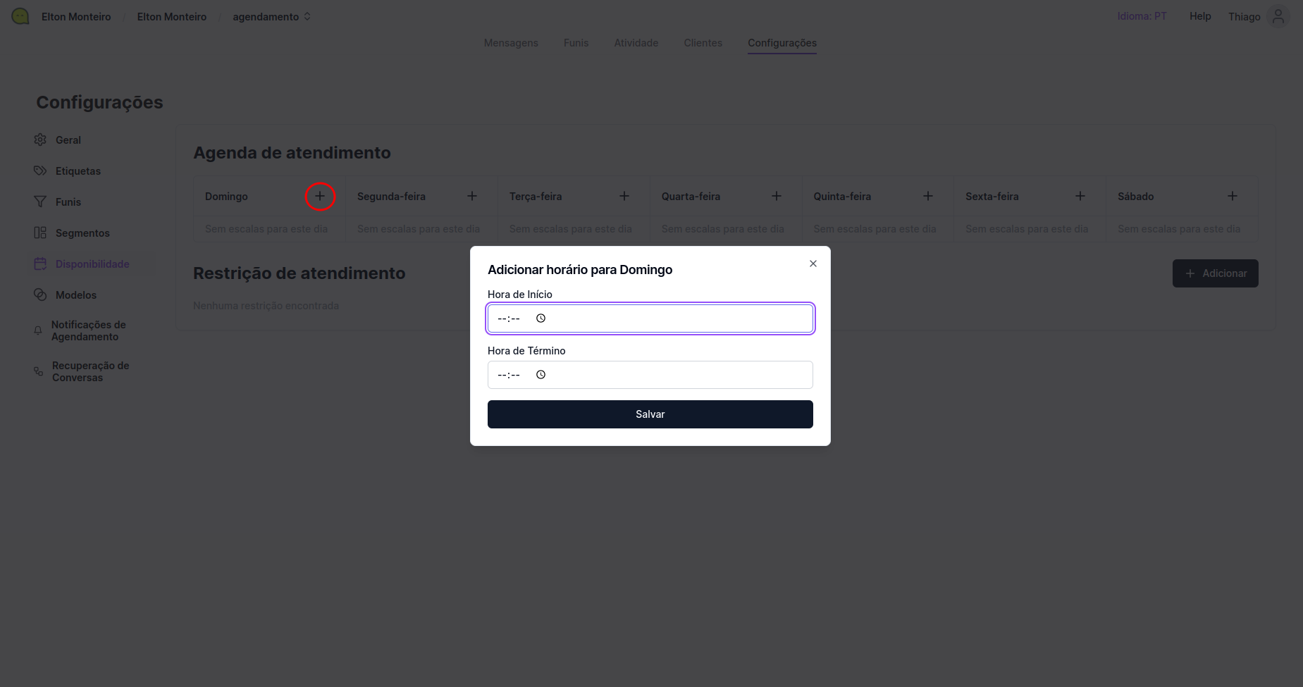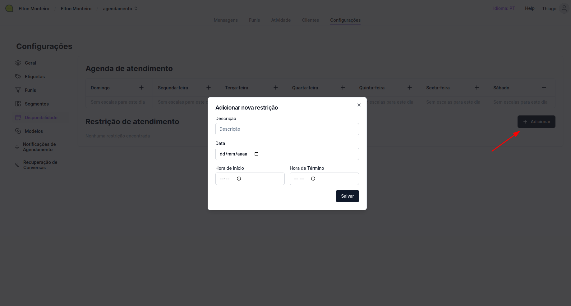 - Para configurar sua agenda de atendimento, acesse a aba Configurações e clique na opção Disponibilidade no menu lateral. Nesta tela, você poderá definir os horários de atendimento e cadastrar restrições específicas — como feriados ou períodos fora do expediente. Essa funcionalidade permite que o agente de IA informe ao usuário quando não haverá atendimento humano, seja fora do horário definido ou durante alguma data de exceção, garantindo uma comunicação clara e profissional.