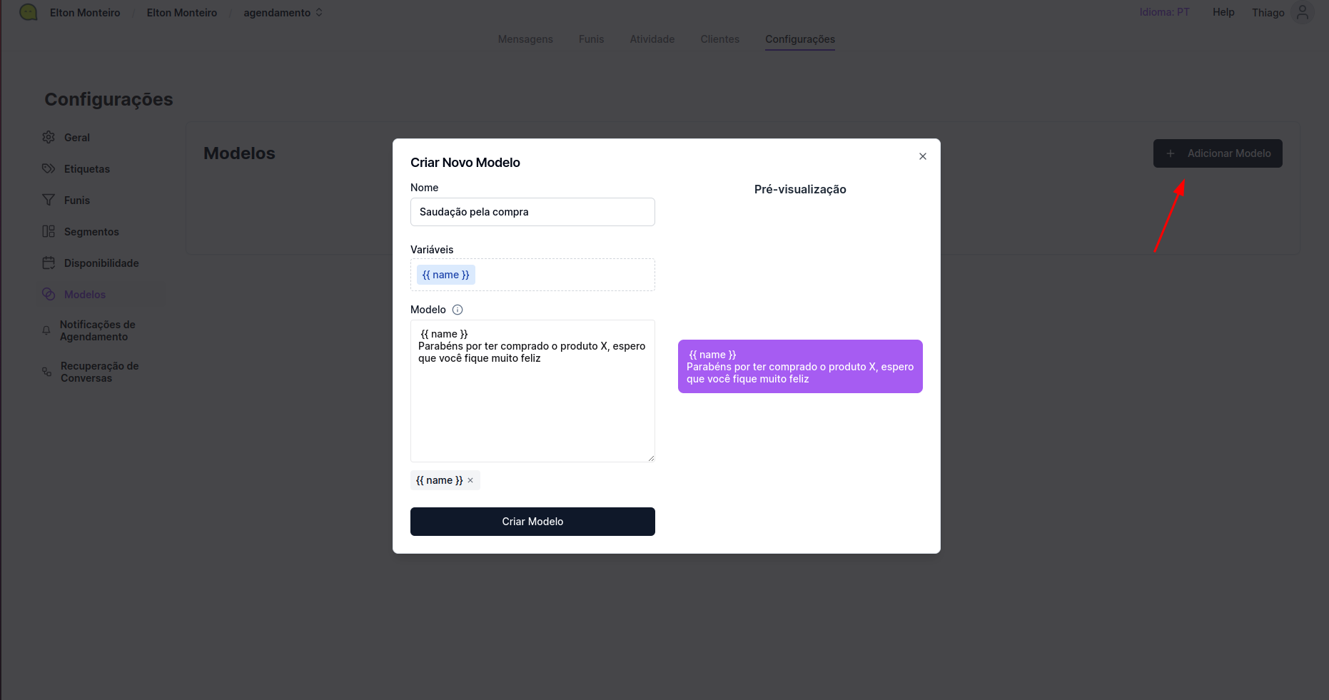 - Para adicionar um modelo, basta clicar em Adicionar Modelo preencher as informações e clicar em Criar Modelo, no exemplo abaixo foi cadastrado uma mensagem de saução ao realizar a compra.