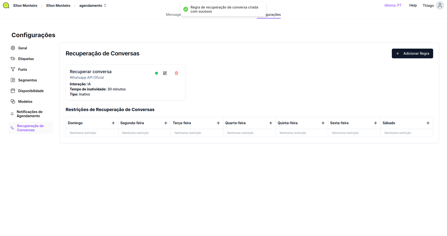- Para adicionar uma regra, basta clicar em Adicionar Regra, preencher todas as informações solicitadas e clicar em Criar Regra de Recuperador de Conversas.
