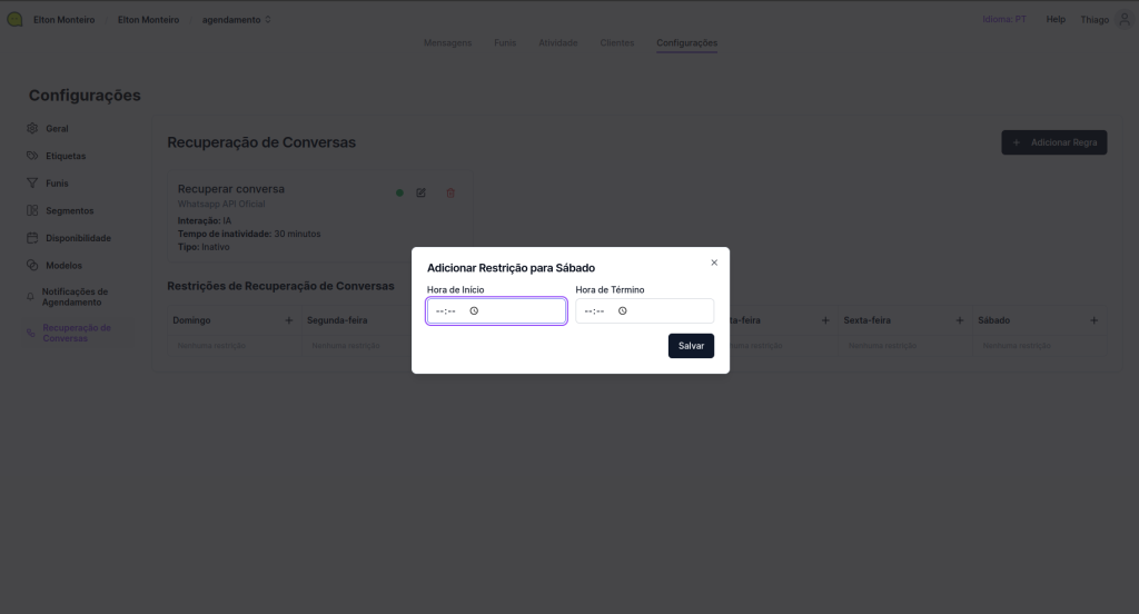 4. Tambem é possível adicionar restrições de horário, para a IA não enviar uma mensagem em um horário indesejado, para isso basta clicar no ícone de + ao lado do dia da semana, informar a Hora Início e Hora de Término e clicar em Salvar.